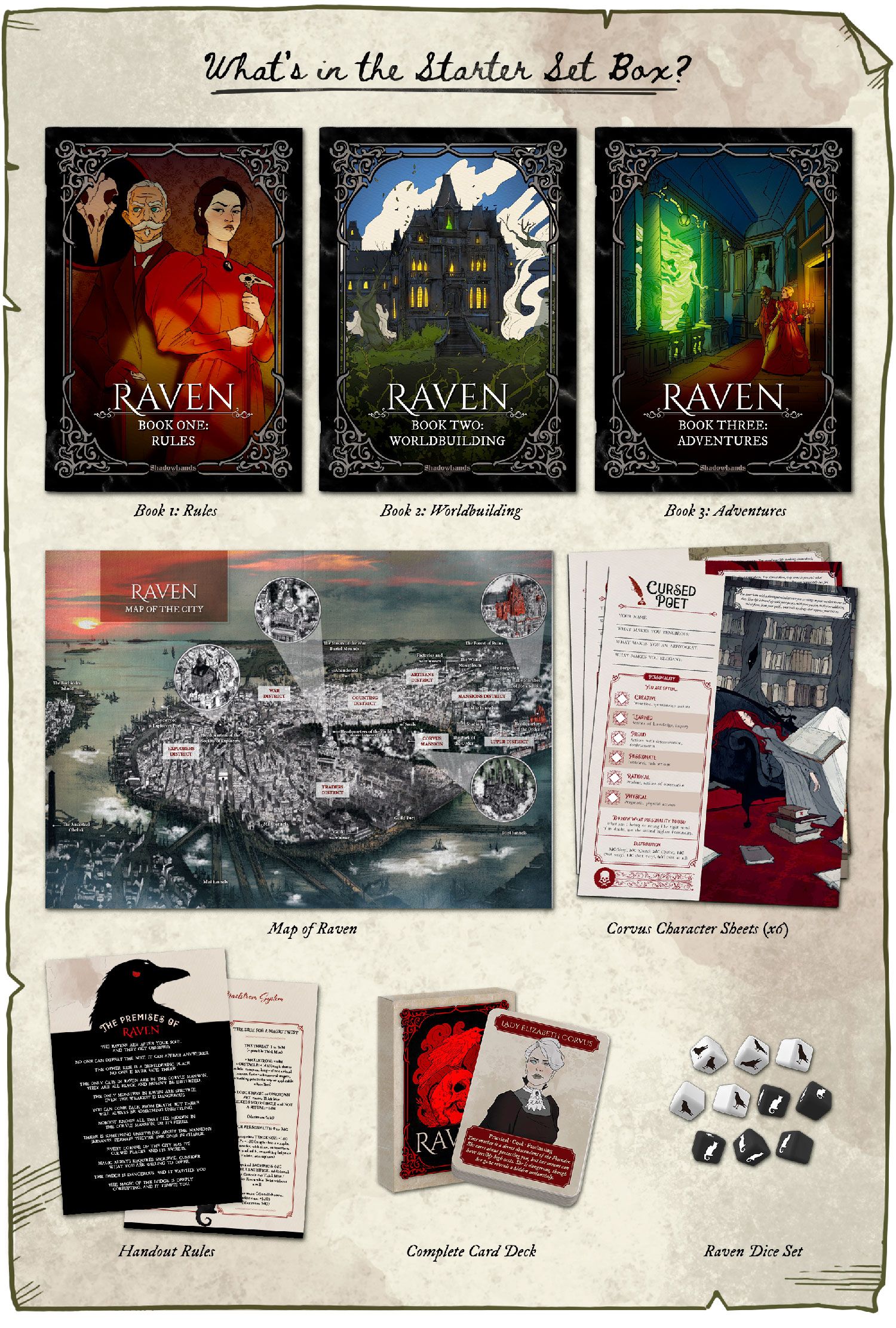 Sit down and start playing tenebrous Raven adventures immediately with this Starter Set, even if you have never played it before or are a complete TTRPG beginner. The Raven Starter Set includes everything you need to play: Rules booklet, World booklet and Adventures, maps, Corvus Character sheets, handouts, Threat cards and a set of dice.
